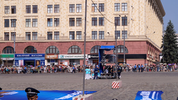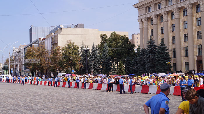 Вся площадь по периметру огорожена, везде стоят кордоны милиции, на торжествах должен присутствовать президент Янукович.