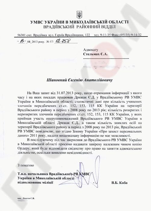 В этом на днях убедился адвокат потерпевшей Евгений Стельмах. Проводя собственное расследование, он направил запрос во Врадиевское РВУ МВД Украины, в котором попросил, согласно закону, в пятидневный срок предоставить информацию о том, с какого времени и на каких должностях Евгений Дрыжак работал во Врадиевском участке. А также - статистические данные о количестве пропавших и совершенных с 2008 по 2013 преступлений, предусмотренных статьями 152, 153, 115 Уголовного Кодекса Украины, и информацию о том, в проведении каких оперативно-розыскных мероприятий принимал участие подозреваемый Дрыжак.