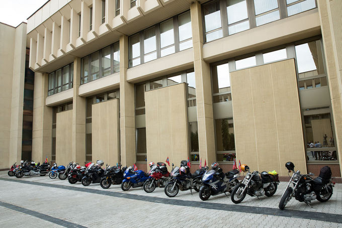 Депутаты Верховной Рады Украины, сотрудники канцелярии, члены байкерского клуба ехали из Киева в Вильнюс с лозунгом "Украина - в Европу". В Вильнюсе байкеры передали флаг своего похода литовским политикам.