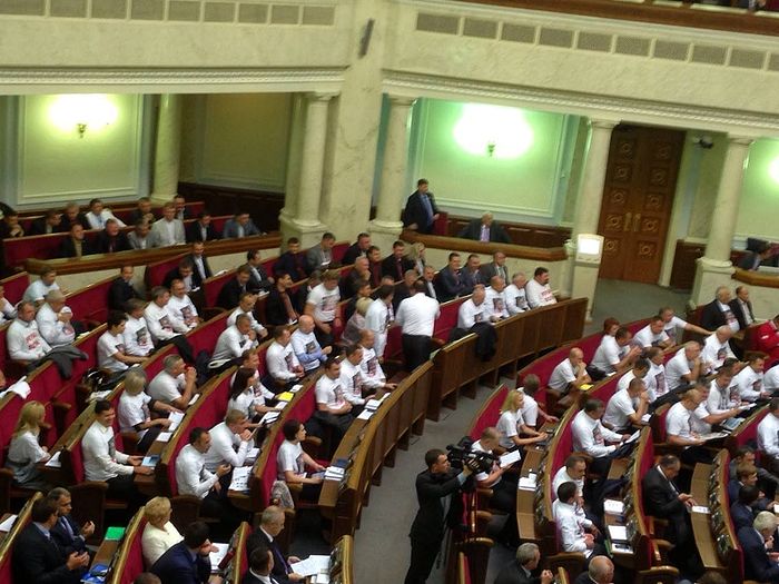 Сообщается также, что депутаты фракции «Батькивщина» пришли на открытие сессии парламента в футболках с изображением лидера оппозиции Юлии Тимошенко за решеткой и надписью «Юле - волю».