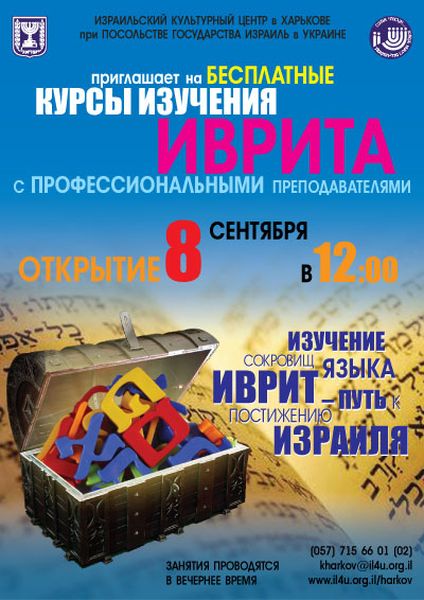 8 сентября в 12.00 в помещении Израильского культурного центра в городе Харькове состоится открытие учебного года – курсов изучения языка иврит - официального языка Государства Израиль.