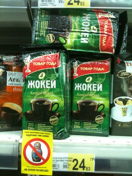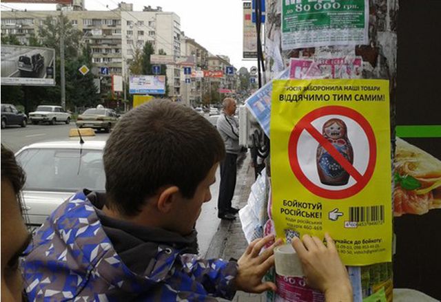 Распространение таких плакатов, листовок, наклеек проходит в разных городах в рамках всеукраинской кампании "Не покупай российское!". Вскоре, по словам организаторов акции, они должны появиться во всех регионах Украины.