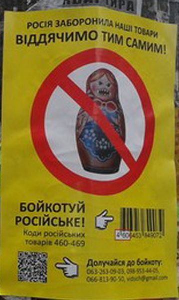 На улицах Киева, Днепропетровска, Одессы, Львова, Житомира и Тернополя появились зубастые матрешки. Именно такой символ размещен на плакатах и наклейках, которые призывают украинцев не покупать российские товары, передает УНН со ссылкой на пресс-службу активистов общественного движения "Отпор".