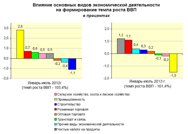 Аналогичная картина наблюдается в РБ. Так, объем ВВП РБ в январе-июле 2013 г. составил в текущих ценах 340,1 трлн. рублей и увеличился по сравнению с январем-июлем 2012 г. в сопоставимых ценах на 1,4%. Прогнозом на 2013 год в соответствии с Указом Президента Республики Беларусь от 25 сентября 2012 г. № 418 предусмотрен его рост на 8,5%, что с учетом текущей динамики невыполнимо к концу года.