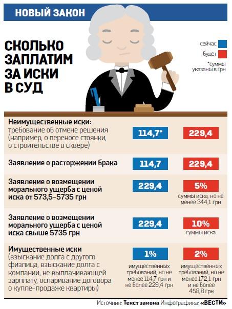 Судиться украинцам станет дороже. В два раза больше, согласно принятому Радой законопроекту, придется выкладывать за разводы и просто гигантские суммы — за иски по моральному ущербу. Документ, которым изменяется порядок уплаты судебного сбора, направлен на подпись президенту. Сам закон призван улучшить материально-техническую базу наших судов.
