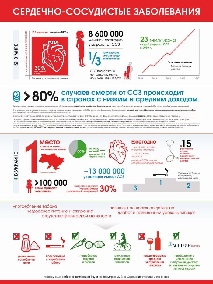 Ежегодно в мире около 9,4 миллионов людей умирает от сердечно-сосудистых заболеваний. Среди них 51% людей гибнет от инсульта и 45% — от ишемической болезни сердца. Болезни сердечно-сосудистой системы в современном мире, в том числе в Украине, называют проблемой № 1. Ежегодно от ССЗ умирают более 500 тыс. украинцев, то есть в среднем каждый день погибают 1370 человек, отмечают в фармкомпании "Байер". По данным Государственной службы статистики, в 2013 году в Украине порядка половины смертей обусловлено сердечно-сосудистыми заболеваниями. В сравнении с 2012 годом показатели количества смертности в Украине практически не изменились. Это говорит о низкой культуре профилактики, диагностики и лечения сердечно-сосудистых заболеваний среди украинцев.