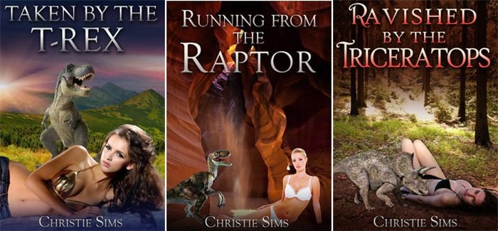 "Они называют себя Кристи Симс и Эйлара Брэнвен, им примерно по 20 лет, пока они предпочитают не раскрывать свои подлинные имена", - сообщает автор о писательницах. Названия у книг - вроде "Похищенная трицератопсом", на обложках - женщины в бикини, явно желающие, чтобы их соблазнили ящеры.