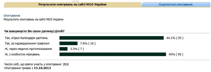 Примечательно, что провал бездумной вакцинации уже, скорее всего, ощутили в ведомстве Раисы Богатыревой. Пытаясь выяснить истинное отношение граждан Украины к вопросам вакцинации, на сайте Минздрава с 15 по 24 октября проводили интерактивный опрос «Вакцинируете ли вы своих детей?» В качестве возможных ответов предполагались 4 варианта. Результаты опроса, даже в том виде, в котором он был проведен, достаточно откровенно характеризуют провал принудительной компании по вакцинации: