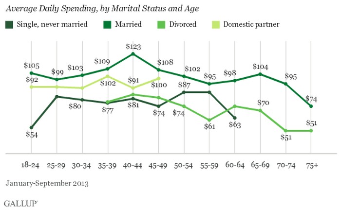 Супружество может поддержать не только демографию, но и экономику. Состоящие в браке американцы в любой возрастной группе тратят куда больше, чем их не обремененные официальными отношениями соотечественники, выяснила Gallup.