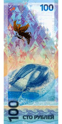 Тираж памятных сторублевок составляет 20 миллионов экземпляров. Изображение на банкноте впервые вертикально ориентировано. На лицевой стороне сторублевки изображен сноубордист в прыжке на фоне олимпийских объектов в Сочи, а на оборотной — главный стадион Игр «Фишт» и жар-птица, похожая на факел.