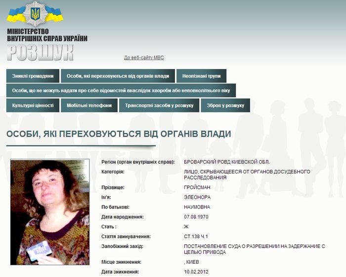 Напомним, Гройсман, главный редактор сайта «Киев еврейский», обвинила МВД Украины в инсинуации и лжи. Объявленная в розыск «как лицо, скрывающееся от органов досудебного расследования», журналистка утверждает, что даже в самом объявлении об ее розыске есть свидетельство того, что речь идет об обмане и грубой подтасовке - оно появилось на сайте ведомства в конце сентября этого года, когда она находилась в Варшаве на конференции ОБСЕ по правам человека. При этом на странице сайта МВД указывалось, что Гройсман «исчезла» из Киева 10 февраля 2012 года.