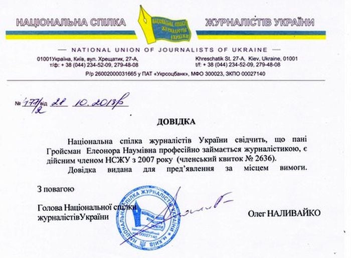 Кроме того, как сообщила Главному Элеонора Гройсман, Национальный союз журналистов Украины официально подтвердил, что вынужденная скрываться в Израиле женщина является журналистом и членом НСЖУ.