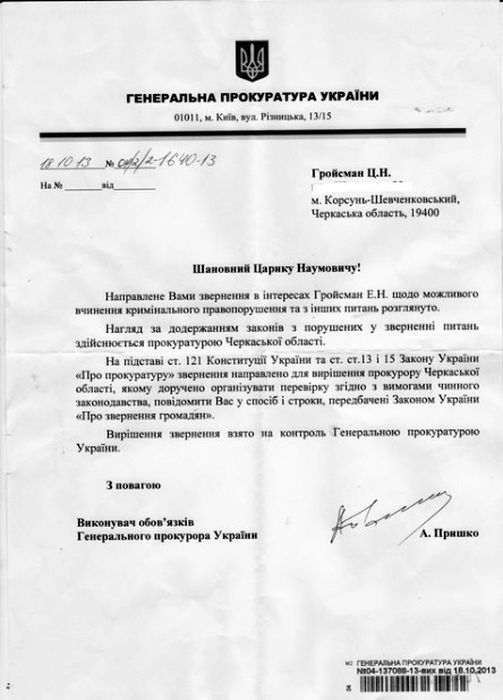 «Ответ пришел в конце прошлой недели: в письме от исполняющего обязанности генпрокурора Анатолия Пришко отмечается, что дело будет взято под контроль. Одновременно к деду пришел прокурор Корсунь-Шевченковского района Александр Гасич. Он сказал, что ему позвонили из Генеральной прокуратуры и дали отдельное поручение - лично записать показания. Прокурор области оформил протокол, записал со слов деда, что я подвергаюсь преследованию за журналистскую и общественную деятельность по сфабрикованному делу. Подписанный дедом документ, прокурор сказал, что сразу же направит в Генпрокуратуру», - рассказала Элеонора Гройсман в беседе с порталом IzRus.