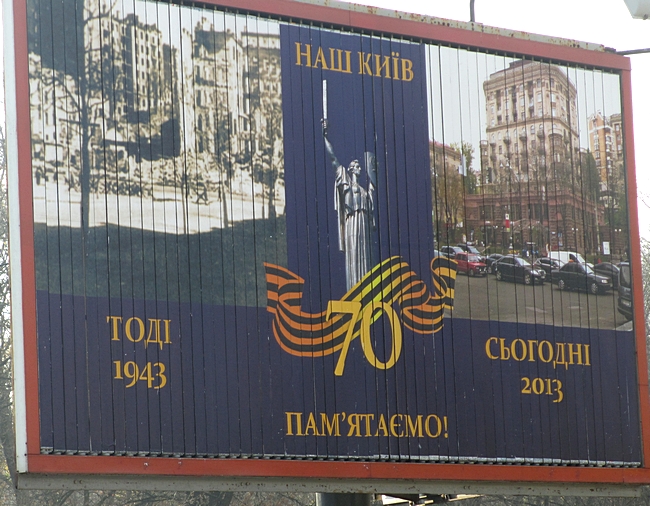 Как передают Комментари, на изображении представлены две фотографии: разрушенного города времен Второй Мировой и его нынешнего вида, а именно – здания по ул. Крещатик, 25, с соответствующими подписями «Тогда» и «Сейчас» соответственно, а также активно используемым ныне слоганом «Помним!». Что, видимо, должно символизировать то, как расцвел город за минувшие 70 лет, в том числе и во времена правления Александра Попова, и в каком плачевном состоянии он достался освободителям в 1943-м (мол, нечего киевлянам жаловаться на бардак и трудную жизнь в столице - были времена и похуже).