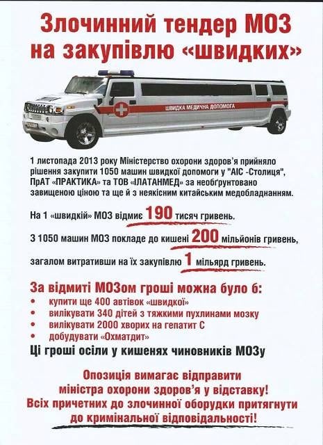 "Аферой на миллиард гривен" называют в "Батькивщине" итоги тендера по закупкам автомобилей скорой помощи, который проводил украинский Минздрав.
