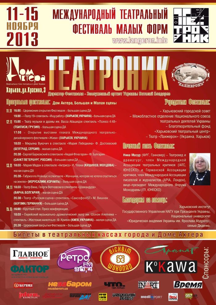 С 11 по 15 ноября 2013г. в Доме Актера состоится Международный Театральный Фестиваль малых форм «ТЕАТРОНИК».