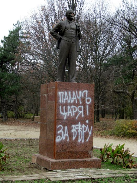 В Мелитополе Запорожской области неизвестные злоумышленники разрушили памятник Владимиру Ленину, изуродовав лицо и оставив надписи, в которых обвинили вождя мирового проллетариата в убийстве российского царя.