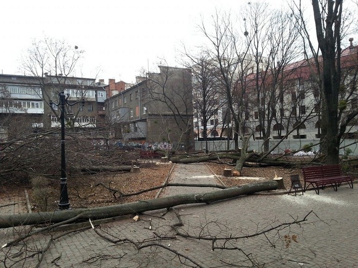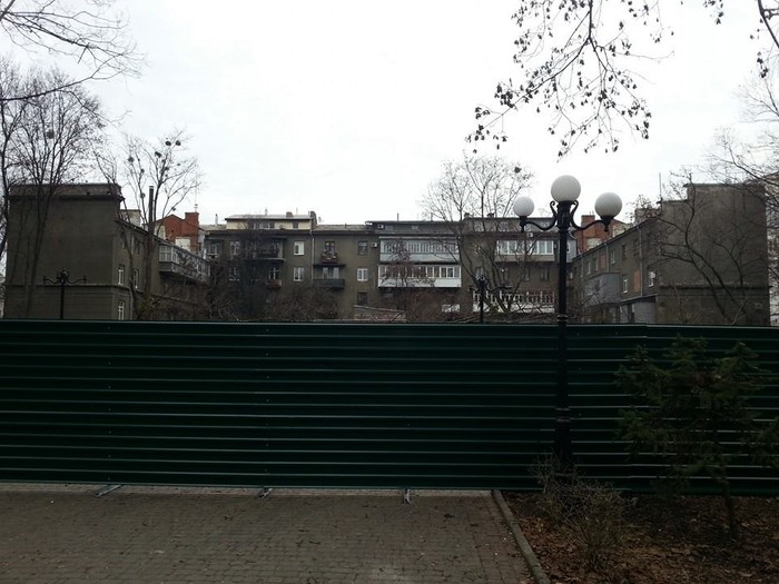 Сегодня были снесены деревья, вывезены декоративные фонари и бюсты героев Советского союза, которые стояли вдоль центральной аллеи сквера.