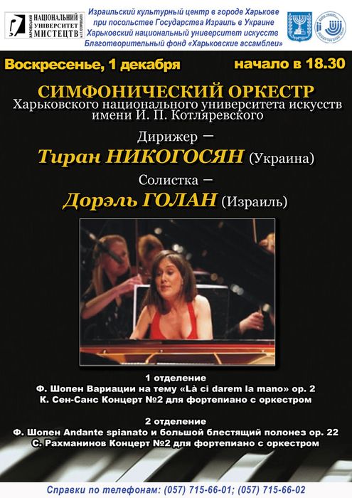 Всем ценителям классической музыки Израильский культурный центр в городе Харькове при поддержке Харьковского национального университета искусств дарит уникальный концерт одного из известных молодых музыкантов государства Израиль – Дорэль Голан.