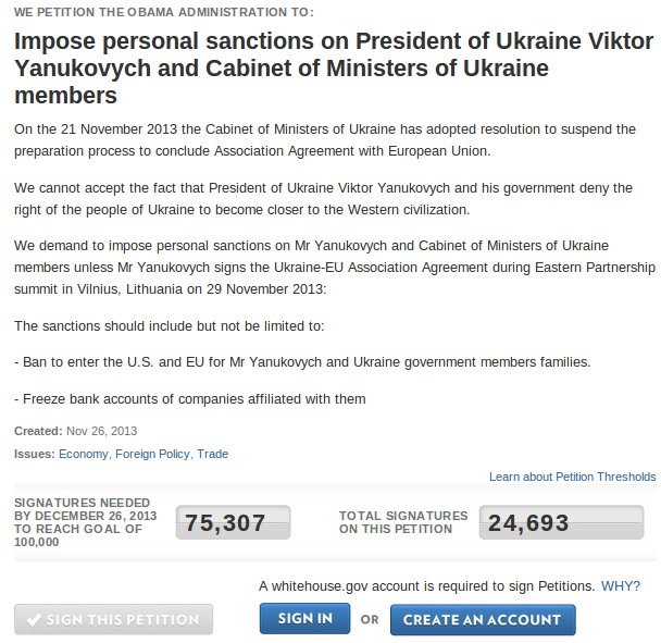Петиция с требованием применить санкции к президенту Украины Виктору Януковичу и членам Кабинета министров этой страны набрала около 25 тыс. подписей на сайте американского Белого дома.
