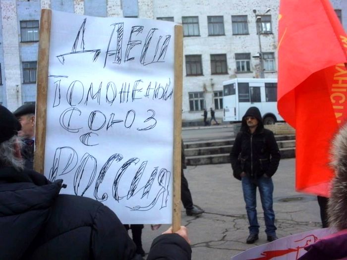 В Снежном, что в Донецкой области, Коммунистическая партия Украины устроила митинг в поддержку таможенного союза, правда, свои плакаты написали неграмотно.