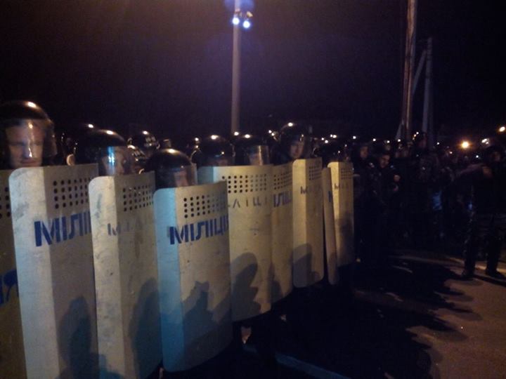 По словам очевидцев, 4 автобуса спецподразделения "Беркут" выстроились перед автомобилистами, а также путь преградил кордон "беркутовцев".