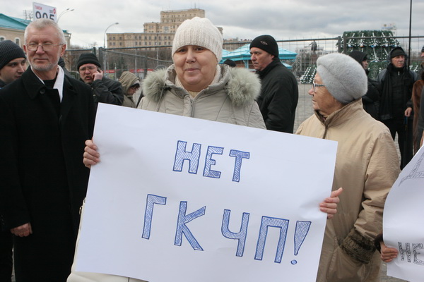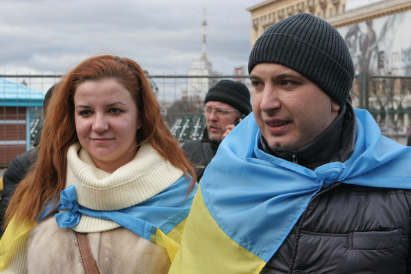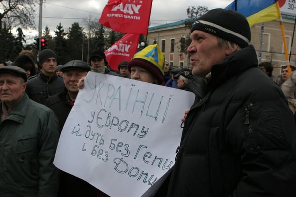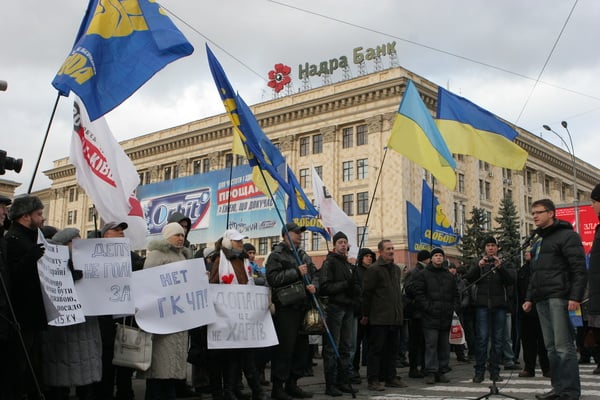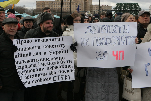Харьковчане вышли на перекрытую пл. Свободы в Харькове, чтобы выразить свой протест возможной попытке депутатов Харьковского облсовета призвать президента страны Виктора Януковича ввести режим ЧП в стране.
