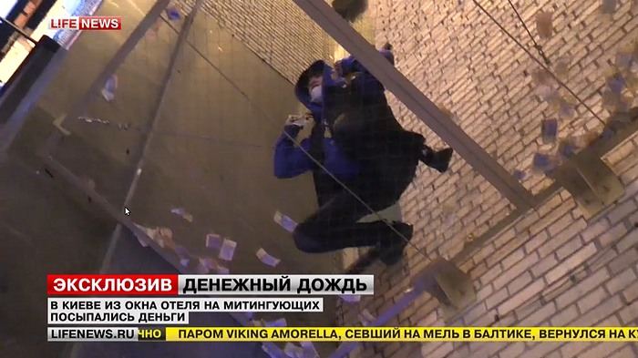 Из окна киевского отеля гражданами России было выброшено несколько тысяч гривен. Купюры со штампом МММ падали на участников акции на Майдане.