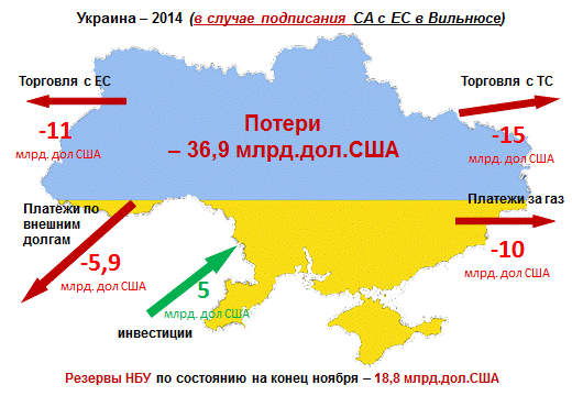 В инфографике указывается, что в случае подписания СА торговые потери со странами ТС в 2014 году составят $15 млрд., без подписания - только $5 млрд. Кроме того, в случае подписания СА, за газ в 2014 году придется заплатить $10 млрд., без подписания - $6,5 млрд. Если просуммировать разницу по этим пунктам, то получится $13,5 млрд., что полностью совпадает с прогнозами российского чиновника.