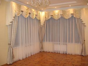 Второй популярный вариант – шторы с ламбрекенами. Он очень уместен для оформления больших помещений, поскольку придает комнате парадный, торжественный вид. В сочетании с высокими потолками выглядит изумительно. Форму ламбрекенов можно придумывать самую различную, насколько хватит фантазии дизайнера. В дополнение тут могут быть и вышивка, и стеганные фрагменты, и сложные контуры нижнего края, и отделка бахромой и позументами. Для ламбрекена нужен свой отдельный карниз, только в этом случае получится идеальная форма. Конечно, можно попробовать прицепить ламбрекен и на общий карниз, но тут потребуется настоящий талант дизайнера, чтобы точно просчитать форму и конструкцию.