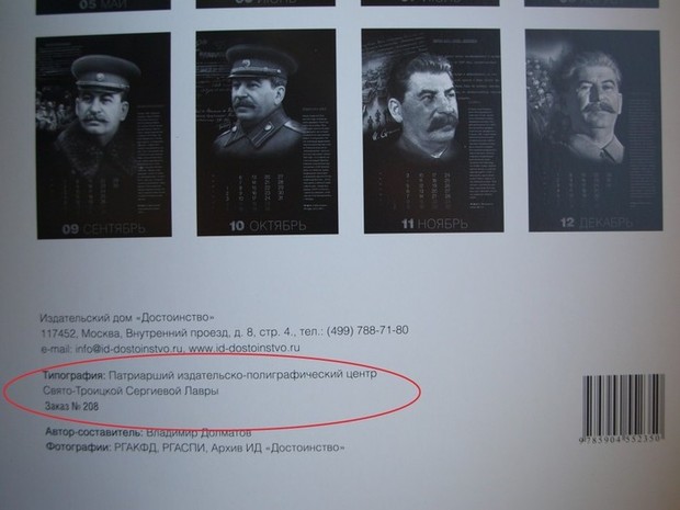 О том, что патриарший издательско-полиграфический центр Свято-Троицкой Сергиевой Лавры напечатал календарь на 2014 год с изображениями Иосифа Сталина, на своей странице в ЖЖ сообщил профессор РГГУ, историк Михаил Бабкин. Он отмечает, что из помещенных на календаре данных следует: оригинал-макет изготовили в издательском доме "Достоинство", а отпечатали в патриаршей типографии.