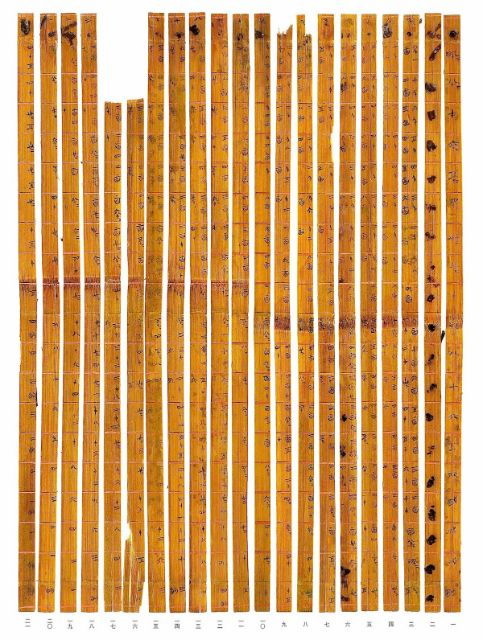 Каждая полоса около 7-12 миллиметров в ширину и до полуметра длиной, и на каждой расположена вертикальная строка древней китайской каллиграфии, написанная черными чернилами. Историки сразу же признали находку одним из важнейших артефактов того периода. Поначалу они предполагали, что бамбуковые полосы содержат 65 древних текстов.