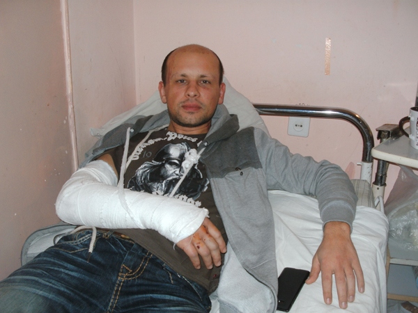 В одной палате с Кириллом и Сергеем лежит еще один пострадавший от рук «Беркута» — активист автомайдана Ярослав Гончар. У мужчины многочисленные гематомы и ссадины, а правая рука в гипсе — в ней несколько трещин и разорванная мышца предплечья. Этими травмами и полностью разбитой машиной для Ярослава закончилась езда впереди колонны с автобусами направлявшихся в Киев силовиков.