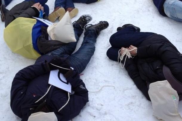 Как сообщают организаторы, участники акции символично надели мешки на головы и завязали руки, чтобы показать, как украинская власть расправляется с гражданами, которые выступают против режима .