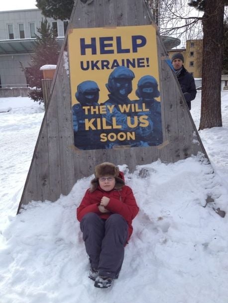 Также они держали баннеры со слоганами: "Помогите Украине! Или они нас убьют! ", " Возвращение в СССР ", " Требуем санкций против режима ".