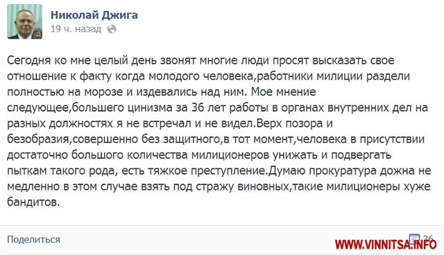 Депутат Верховной Рады от Винницкой области, экс-губернатор и генерал милиции Николай Джига на своей странице в Facebook осудил факт издевательства сотрудников «Беркута» и милиции над беззащитным человеком.