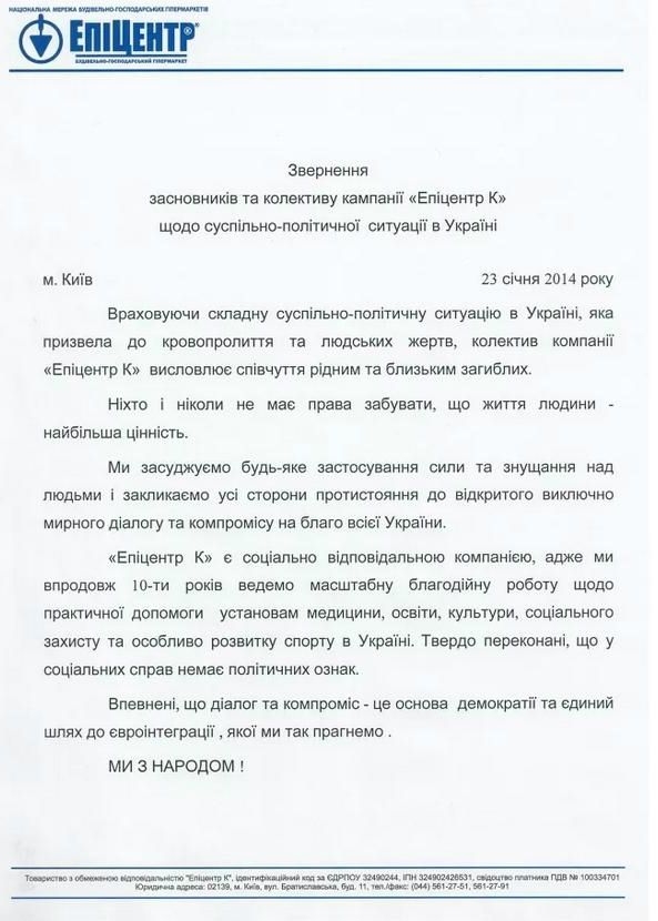 Компания "Эпицентр К" (оператор сети строительно-хозяйственных гипермаркетов) распространила заявление с призывом к мирному разрешению острого политического конфликта в Украине, передает УНИАН.