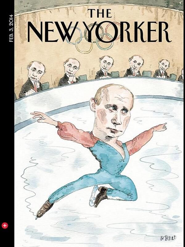 Несколькими днями ранее журнал The New Yorker поместил на обложку стилизованную карикатуру. Путин выступает на льду в костюме фигуриста, а судьи-Путины ставят ему оценки.