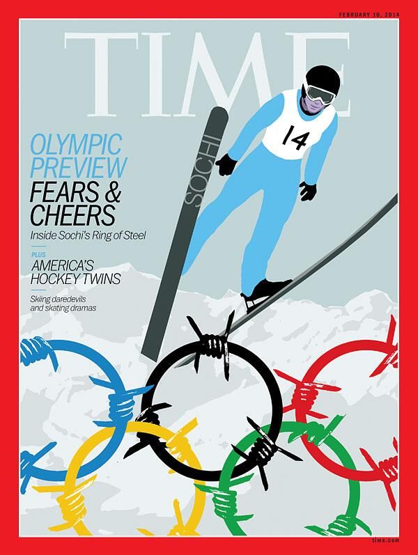 Журнал TIME сделал серию обложек. На одной из них олимпийские кольца изображены в виде скрученной колючей проволоки, а заголовок гласит «Внутри сочинского железного периметра».