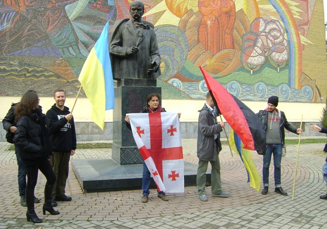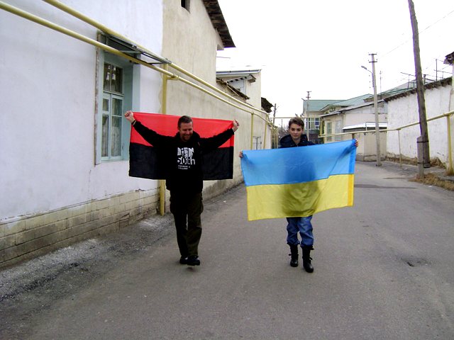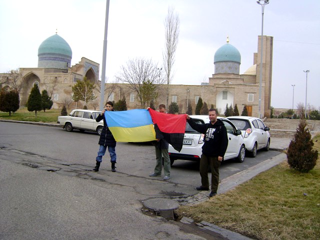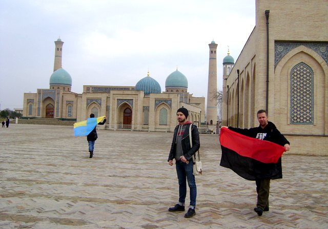 Затем они гуляли по Ташкенту с украинскими и грузинским флагами, фотографировались у памятника украинскому писателю Тарасу Шевченко, и у религиозного комплекса Хаст Имам.