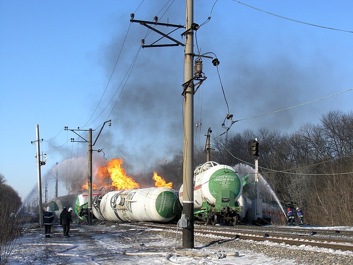 Авария поезда произошла 2 февраля примерно в шесть утра по местному времени. С рельсов сошла 21 цистерна с пропан-бутаном. Три цистерны загорелись. Всего поезд, следовавший из Казахстана в Одессу, состоял из более чем 60 цистерн. Большинство из них оттянули на безопасное расстояние. В результате происшествия никто не пострадал.