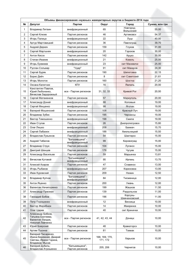 Документы о бюджетных субвенциях по округам на 2014 год демонстрируют огромный перекос в сторону или откровенно провластных депутатов, или внефракционных, голосующих синхронно с Партией регионов.