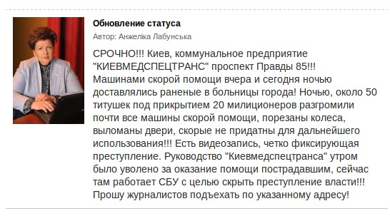 Ночью, около 50 титушек под прикрытием 20 милиционеров разгромили почти все машины скорой помощи, порезаны колеса, выломаны двери, скорые не придатны для дальнейшего использования!!! Есть видеозапись, четко фиксирующая преступление. Руководство "Киевмедспецтранса" утром было уволено за оказание помощи пострадавшим, сейчас там работает СБУ с целью скрыть преступление власти!!! Прошу журналистов подъехать по указанному адресу!", - написала Лабунская.