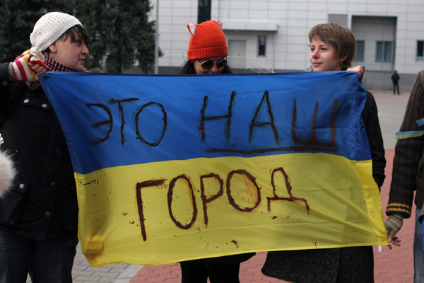 Также, на месте присутствует личная охрана Кернеса и активисты, которые приготовили флаг Украины с надписью йодом: "Это наш город!"