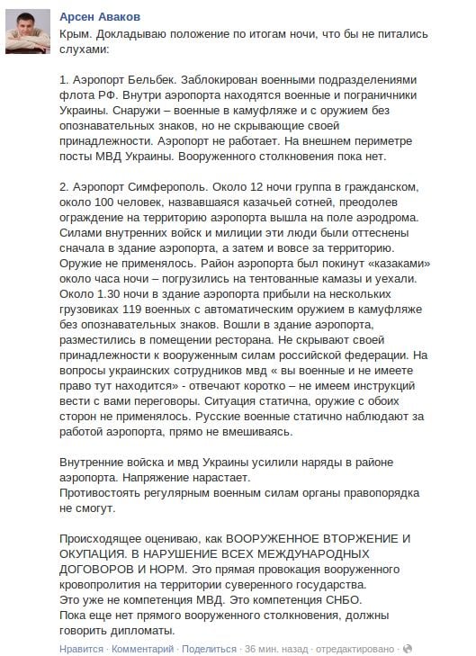 По словам Авакова, в ночь на 28 февраля российские военные с автоматическим оружием прибыли в аэропорты Севастополя и Симферополя. При этом аэропорт Севастополя «Бельбек» заблокирован военнослужащими ВМФ России, тогда как аэропорт «Симферополь» продолжает работу в штатном режиме. В обоих аэропортах с российскими военными соседствуют сотрудники МВД Украины, однако никаких столкновений между ними не происходило, оружие не применялось. Аваков добавил, что российские военные отказываются вступать в переговоры с украинской стороной, заявляя, что не уполномочены на это.
