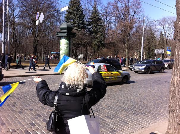 В знак солидарности с собравшимися проезжающие по центральной улице Харькова автомобили сигналят.