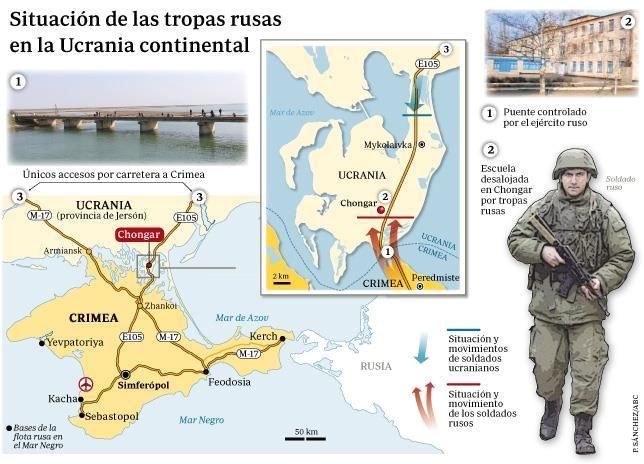 "Российский флаг развевается над блокпостом в Чонгаре - населенном пункте в Херсонской области за пределами Крымского полуострова, который российская армия превратила в новую границу Крыма", - утверждает ABC. По словам корреспондента Микеля Айестарана, здесь сообща обеспечивают безопасность "анонимные "люди в зеленом", бойцы "Беркута" и казаки.