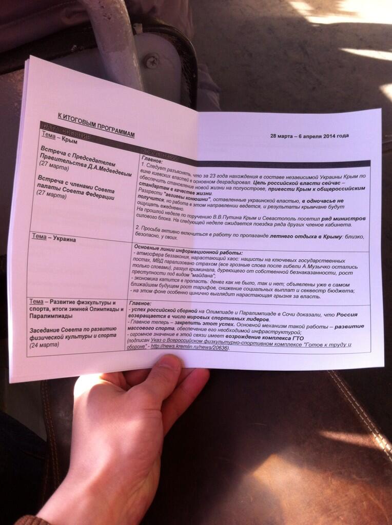 Кроме того, российские журналисты должны рассказывать о "разгуле криминала" в Украине, а также "нарастающей грызне за власть".