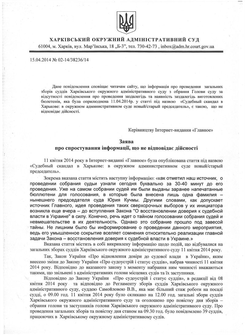 Далее Главное оставляет без комментариев письмо, полученное из Харьковского окружного административного суда. Только еще раз позволим себе напомнить, что указанный выше закон вступил в силу с момента его опубликования утром 11 апреля. Выводы о скорости его применения судом и причинах такой спешки предлагаем сделать читателям самостоятельно.