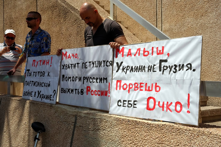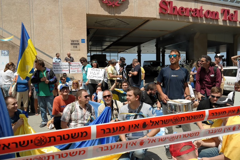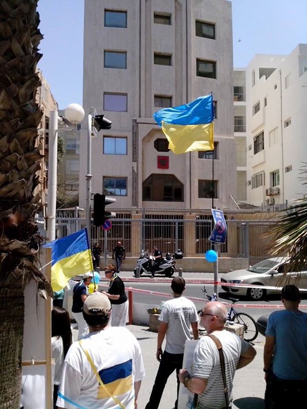 Сторонники территориальной целостности Украины, проживающие в Израиле, провели санкционированную властями демонстрацию у посольства России, расположенного на улице Ха-Яркон в Тель-Авиве.